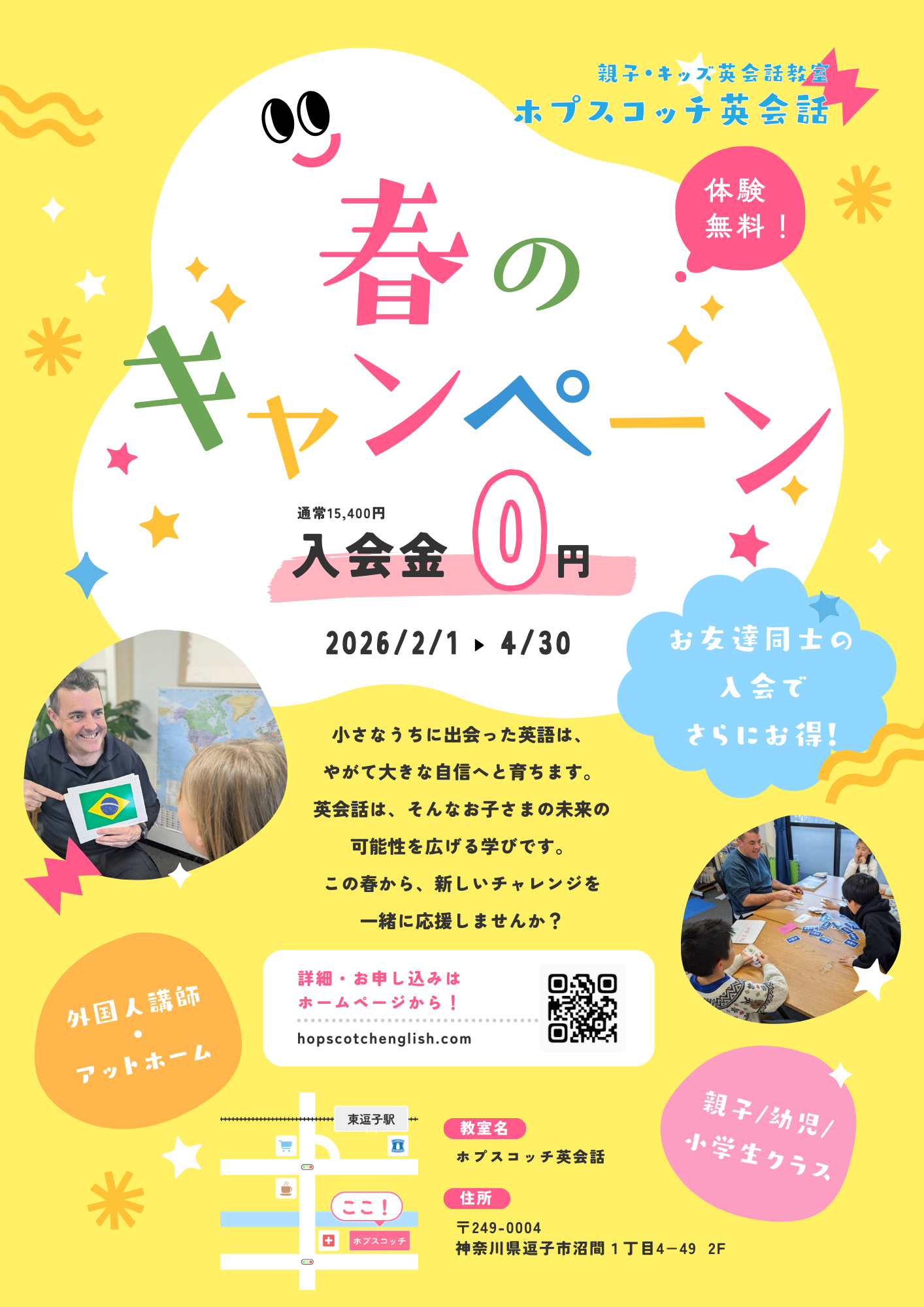 イベント新学期に向けての準備期間として、春の入会無料キャンペーンを2月よりスタートします。英会話はいかに早い段階から始めて、お子さんの「英語耳」を育ててあげられるかが勝負です。始めるなら入会金0円の今がチャンス&今ならご兄弟やお友達と一緒のご入会でさらにお得!この機会に是非英会話を一緒に始めましょう!